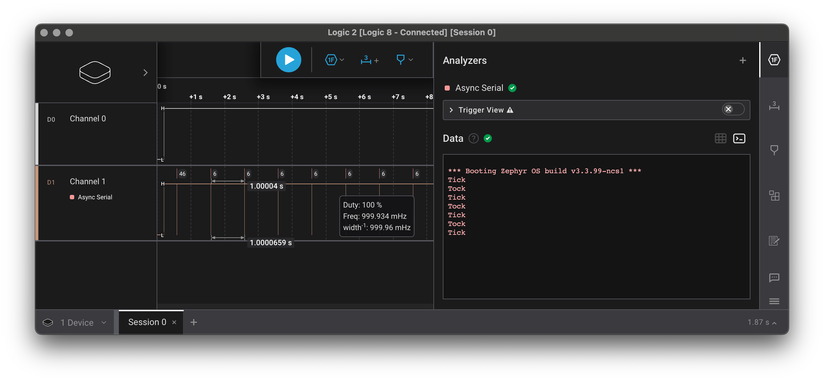 Also, the output for the J-Link device remains empty, meaning that we really rerouted our UART node. A bit more intricate than reassigning GPIOs, but just as flexible.