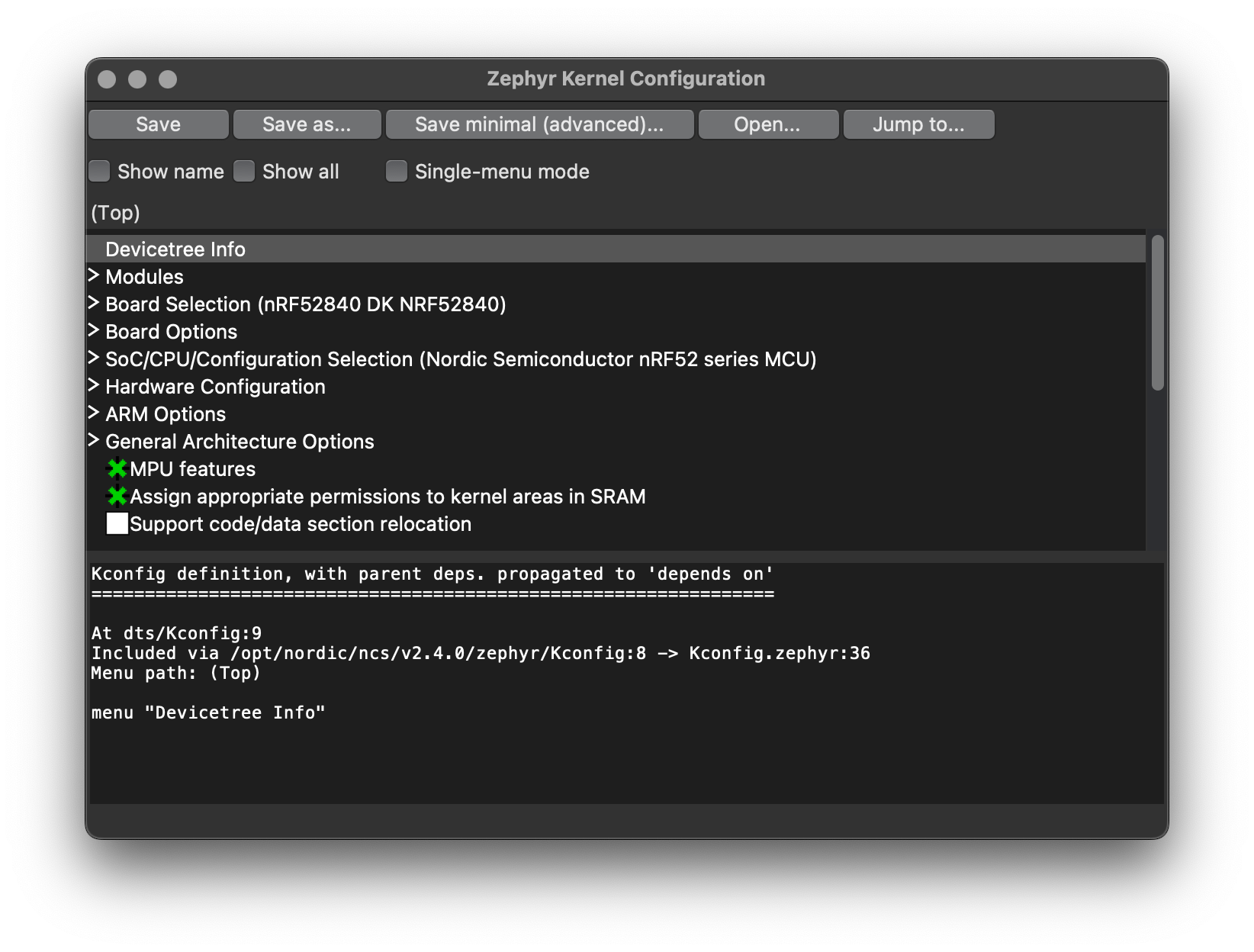 Notice: If you did not build your project or the build system cannot build the required targets due to CMake/Kconfig processing issues, the tool will not load since the zephyr/.config file is missing.